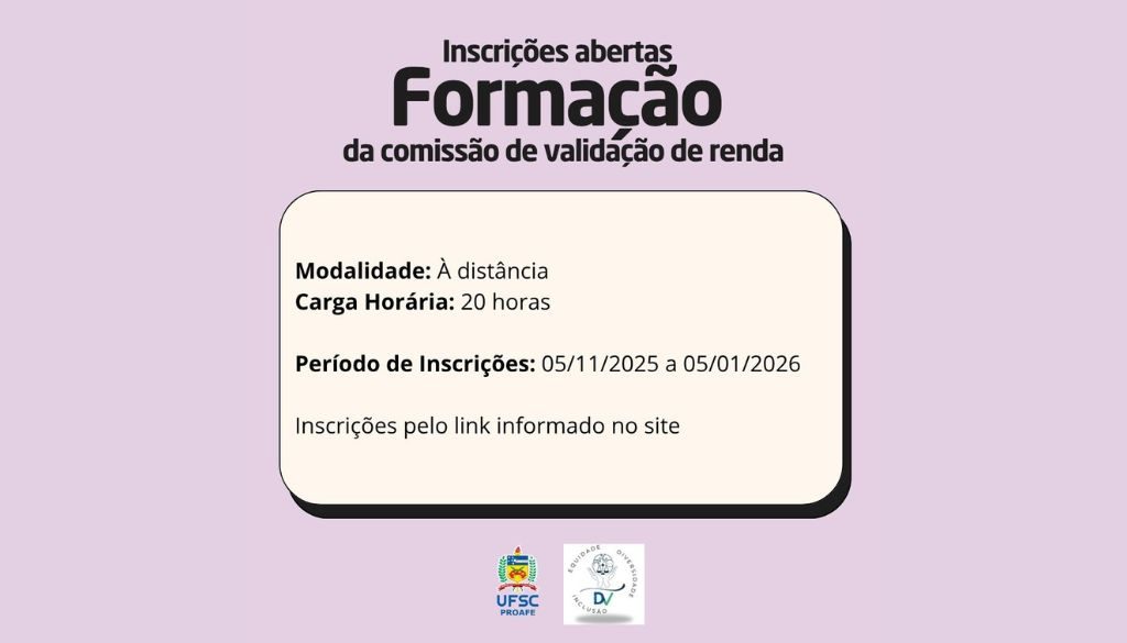 slideshow 1 2 3 4 5 Curso de Formação da Comissão de Validação de Renda – UFSC Curso de Formação da Comissão de Validação PcD – UFSC Portal de Atendimento Institucional (PAI) Novo canal do Departamento de Validações no YouTube Atualização no Cronograma de Chamadas para os ingressantes UFSC 2025 Acessos Rápidos Chamadas Formulários Portarias Portarias em LIBRAS Recursos CAGRWEB Tutoriais em LIBRAS Código de vagas Portal de Atendimento Institucional (PAI) Calcule Sua Renda Canal do DV